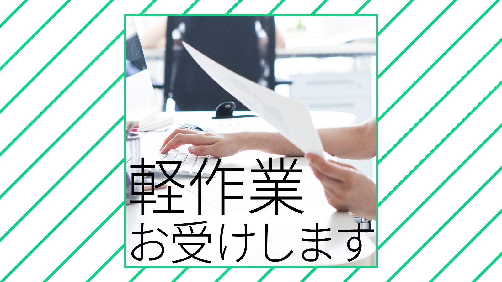 書類・事務のお手伝い・伝票、名簿などのデータ入力 ・書類の封入・封かん、仕分け ・簡単なファイル整理など